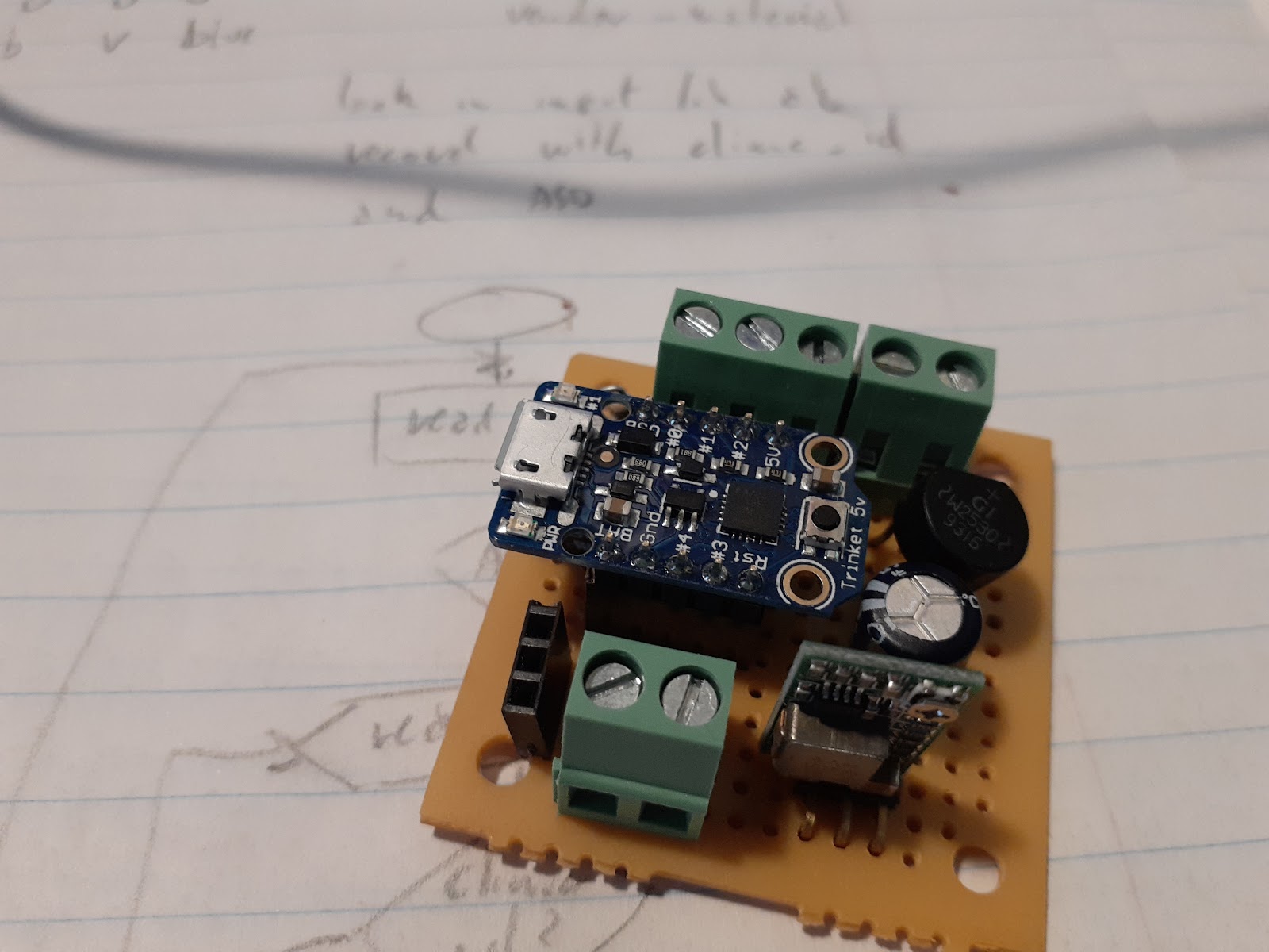 I had around some 5cm x 5cm breadboard so I tried to put everything on it, little bit crammed.